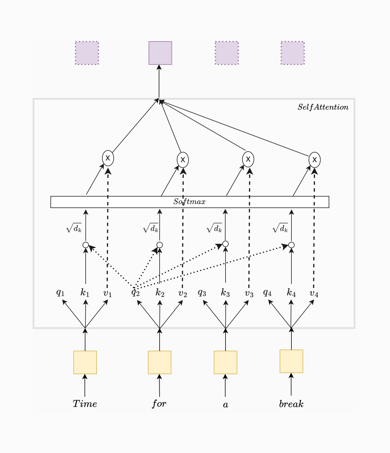 As shown in the figure, each word is associated with a query, key, and value vector (labeled as , , and for each word ). These vectors are learned during training.