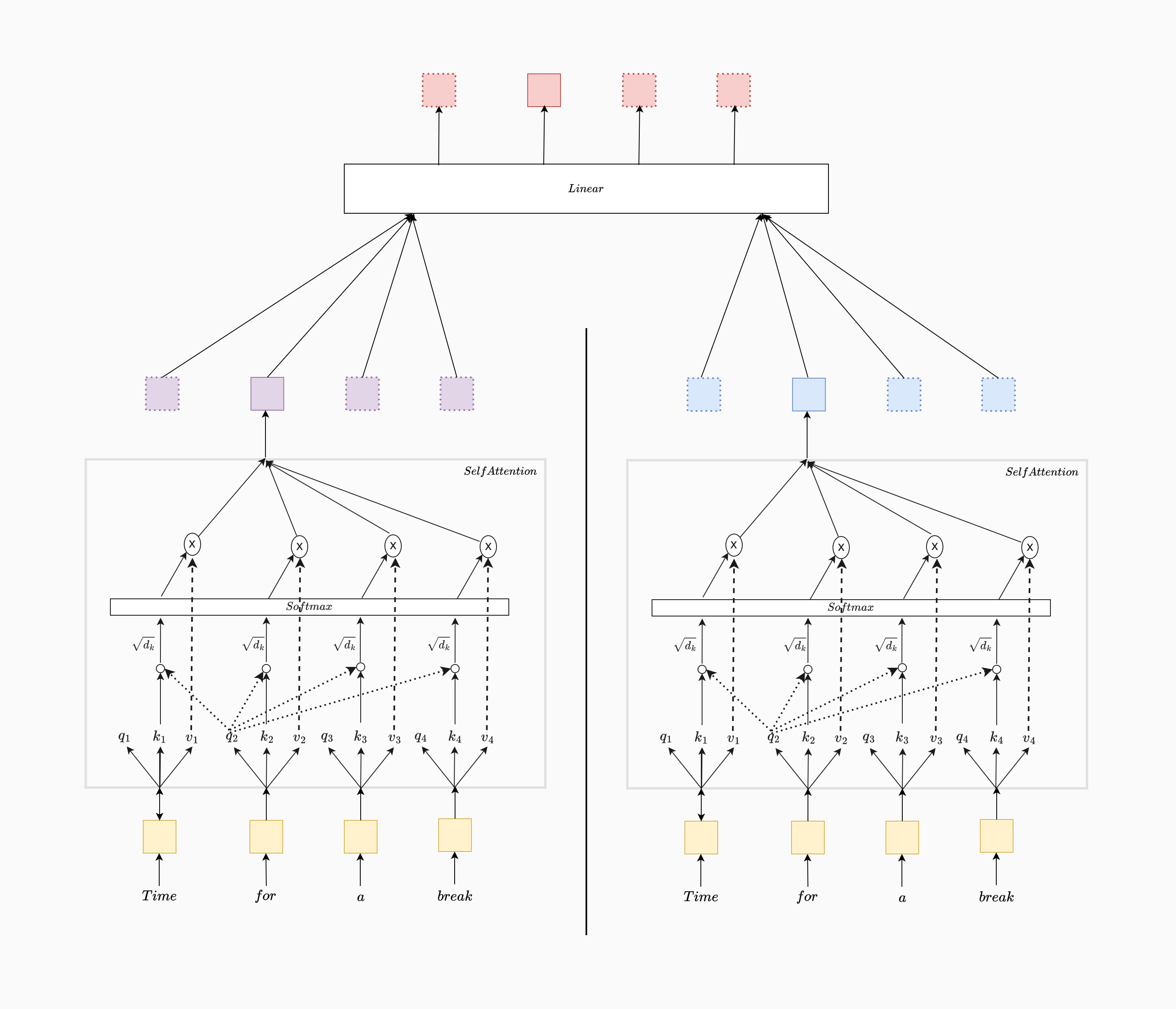 As shown in the figure, each word is associated with a query, key, and value vector (labeled as , , and for each word ). These vectors are learned during training.